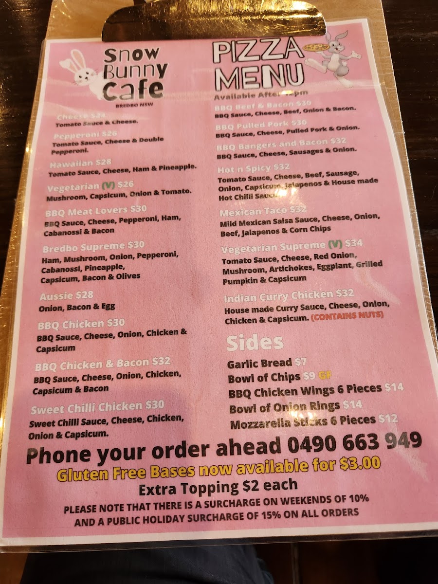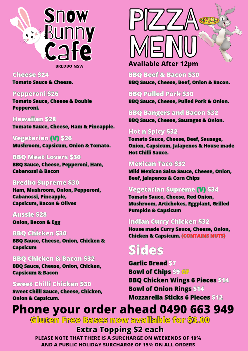 For heartier meal choices, the menu offers several types of pizzas with housemade sauce and mozzarella cheese. Options include Cheese & Tomato, Pepperoni with double pepperoni, Hawaiian with ham and pineapple, Vegetarian featuring mushrooms, capsicum, onion, and tomato, and Meat Lovers with various toppings.