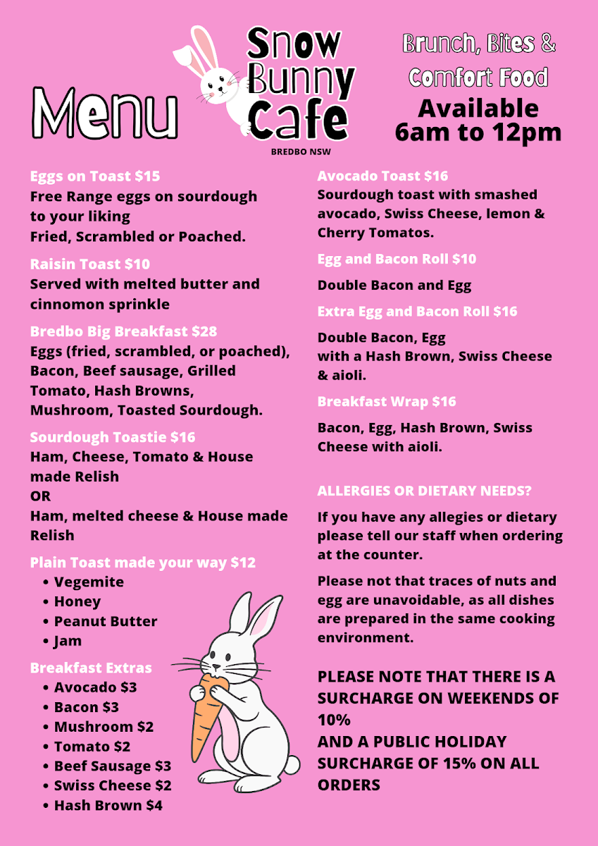 The menu features a variety of food options suitable for breakfast, light meals, and casual dining throughout the day. It includes a selection of toasts and toasties, such as Raisin Toast served with melted butter and cinnamon, and Sourdough Toasties offered with ham, cheese, tomato, and house-made relish.